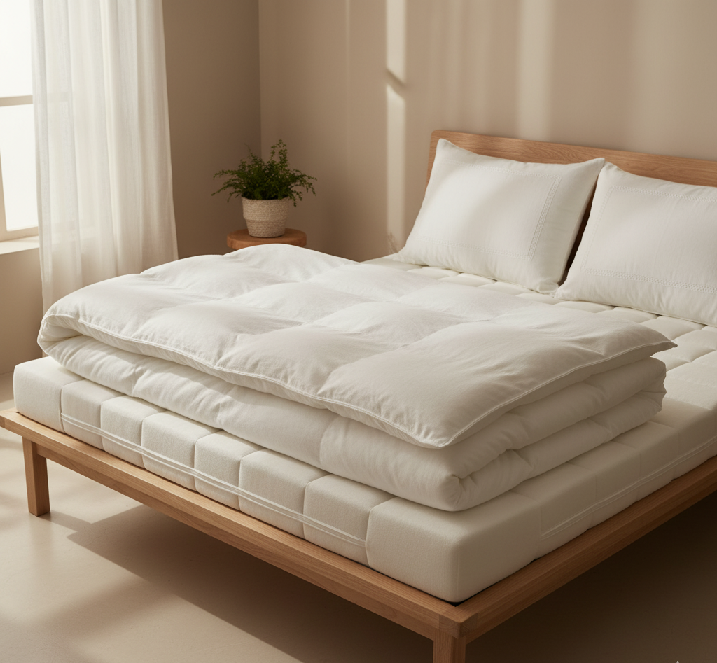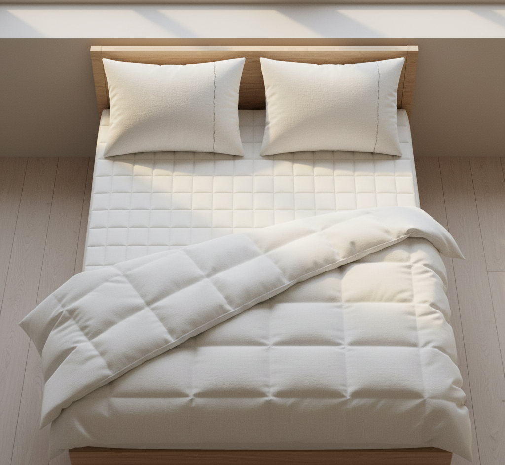 Ideal für Paare, die Wert auf natürlichen Schlafkomfort, nachhaltige Materialien und handgefertigte Qualität legen. Perfekt für alle, die zu zweit schlafen und ein ausgeglichenes Schlafklima bevorzugen – kühl im Sommer, warm im Winter.